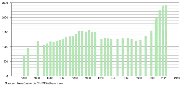 L'évolution du nombre d'habitants est connue à travers les recensements de la population effectués dans la commune depuis 1800. Pour les communes de moins de 10 000 habitants, une enquête de recensement portant sur toute la population est réalisée tous les cinq ans, les populations de référence des années intermédiaires étant quant à elles estimées par interpolation ou extrapolation[21]. Pour la commune, le premier recensement exhaustif entrant dans le cadre du nouveau dispositif a été réalisé en 2007[22].