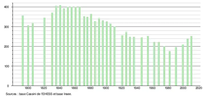 L'évolution du nombre d'habitants est connue à travers les recensements de la population effectués dans la commune depuis 1793. À partir du , les populations légales des communes sont publiées annuellement dans le cadre d'un recensement qui repose désormais sur une collecte d'information annuelle, concernant successivement tous les territoires communaux au cours d'une période de cinq ans. Pour les communes de moins de 10 000 habitants, une enquête de recensement portant sur toute la population est réalisée tous les cinq ans, les populations légales des années intermédiaires étant quant à elles estimées par interpolation ou extrapolation[8]. Pour la commune, le premier recensement exhaustif entrant dans le cadre du nouveau dispositif a été réalisé en 2005[9],[Note 1].