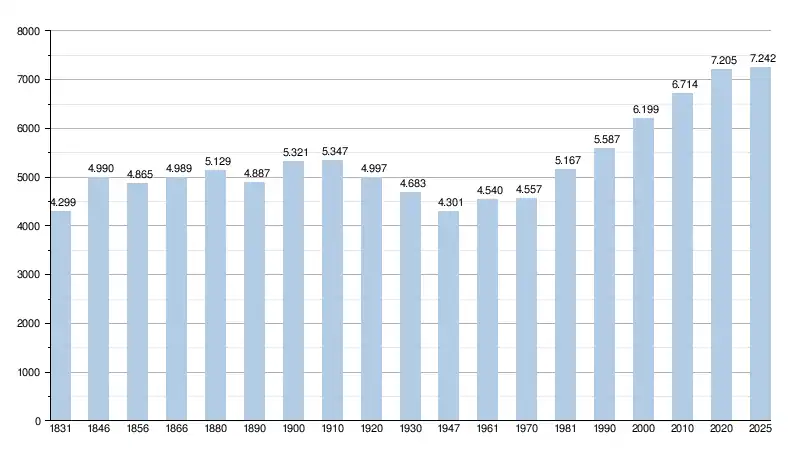 Les chiffres des années 1831 à 1970 tiennent compte des chiffres des anciennes communes fusionnées.