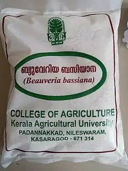 Sac de spores de B. bassiana produit par l'Université agricole du Kerala (en) pour la lutte biologique.
