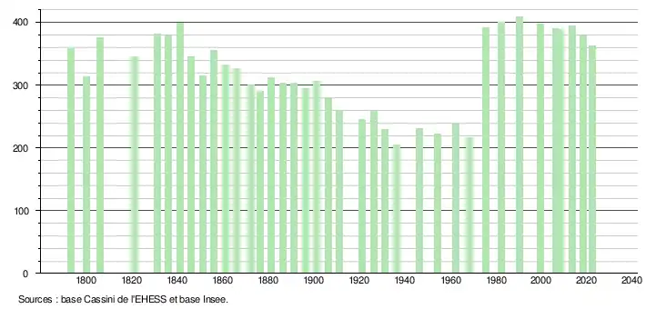 L'évolution du nombre d'habitants est connue à travers les recensements de la population effectués dans la commune depuis 1793. Pour les communes de moins de 10 000 habitants, une enquête de recensement portant sur toute la population est réalisée tous les cinq ans, les populations de référence des années intermédiaires étant quant à elles estimées par interpolation ou extrapolation[41]. Pour la commune, le premier recensement exhaustif entrant dans le cadre du nouveau dispositif a été réalisé en 2008[42].