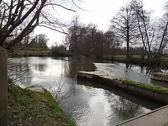 M. Vaugeois décrit la construction comme « […] un ouvrage hydraulique remarquable et ancien. C'est un barrage de la rivière solidement établi en maçonnerie, et présentant, en amont, un épi qui partage les eaux et les rejette […] dans deux canaux […] »[3]. Ces deux canaux correspondent aux bras forcés de Verneuil au Sud et de Breteuil au Nord. Les berges s'élargissent devant le barrage et forment un bassin de retenue ; deux déversoirs y sont creusés : écartés en amont, ils se rejoignent au niveau de la maçonnerie[4], avec un angle inférieur à 45°[réf. souhaitée]. Les déversoirs ont des lamiers métalliques sur les bords et des piles en pierre de taille réparties le long afin de prévenir la formation d’embâcles.