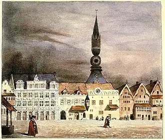 Une terrasse entourée d’une galerie aménagée sur la base du beffroi servit aux anciens ménestriers de la ville, joueurs de hautbois[2]. Le carillon et l’horloge furent transférés au clocher de l’église Saint-Étienne qui servit de beffroi jusqu’à sa destruction par les boulets du siège de 1792[2].