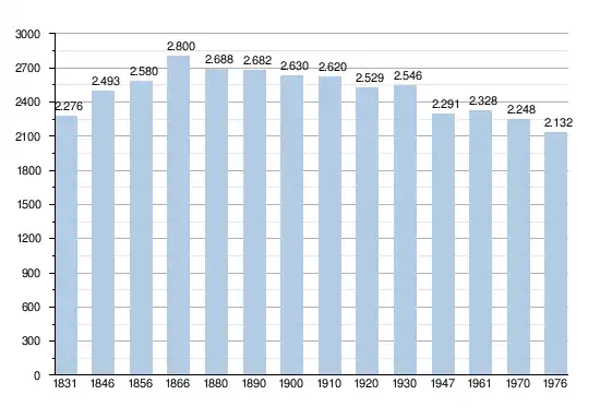 Les chiffres des années 1831 à 1970 tiennent compte des chiffres des anciennes communes fusionnées.