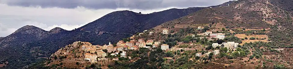 Les vestiges de la tour de guet médiévale E Teghje du XVIe siècle dominent le village.