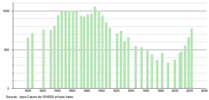 L'évolution du nombre d'habitants est connue à travers les recensements de la population effectués dans la commune depuis 1800. Pour les communes de moins de 10 000 habitants, une enquête de recensement portant sur toute la population est réalisée tous les cinq ans, les populations de référence des années intermédiaires étant quant à elles estimées par interpolation ou extrapolation[19]. Pour la commune, le premier recensement exhaustif entrant dans le cadre du nouveau dispositif a été réalisé en 2008[20].