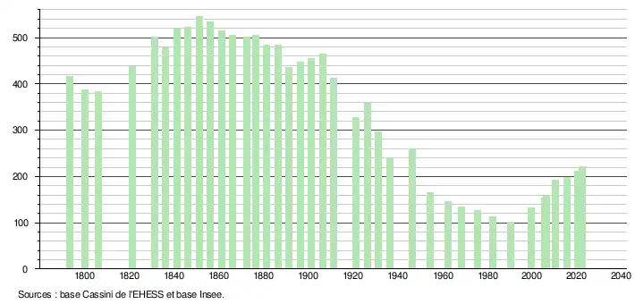 | L'évolution du nombre d'habitants est connue à travers les recensements de la population effectués dans la commune depuis 1793. Pour les communes de moins de 10 000 habitants, une enquête de recensement portant sur toute la population est réalisée tous les cinq ans, les populations de référence des années intermédiaires étant quant à elles estimées par interpolation ou extrapolation[25]. Pour la commune, le premier recensement exhaustif entrant dans le cadre du nouveau dispositif a été réalisé en 2005[26]. En 2022, la commune comptait 222 habitants[Note 1], en évolution de +13,27 % par rapport à 2016 (Landes : +5,78 %, France hors Mayotte : +2,11 %). |