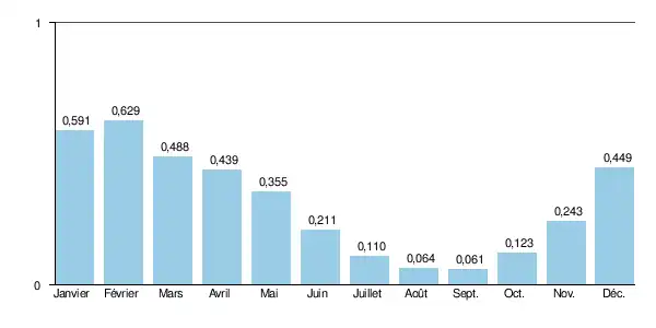 L’importance des crues se traduit par des QIX 2 et QIX 5 relativement faibles qui valent respectivement 3,2 et 5 m3/s. Le QIX 10 est de 6,3 m3/s et le QIX 20 de 7,5 m3/s. Quant au QIX 50, il se monte à 9 m3/s.