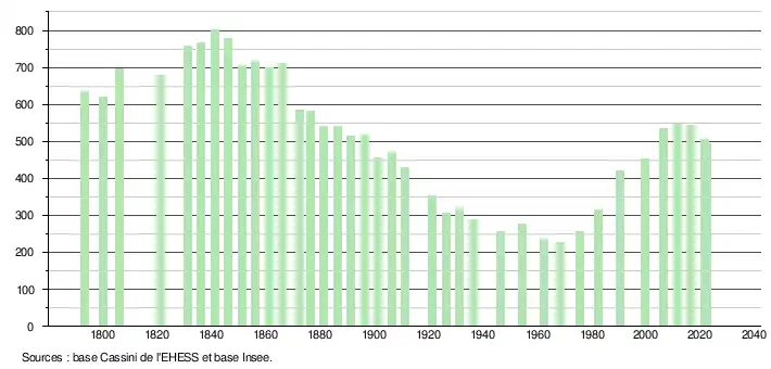 L'évolution du nombre d'habitants est connue à travers les recensements de la population effectués dans la commune depuis 1793. Pour les communes de moins de 10 000 habitants, une enquête de recensement portant sur toute la population est réalisée tous les cinq ans, les populations de référence des années intermédiaires étant quant à elles estimées par interpolation ou extrapolation[14]. Pour la commune, le premier recensement exhaustif entrant dans le cadre du nouveau dispositif a été réalisé en 2006[15].