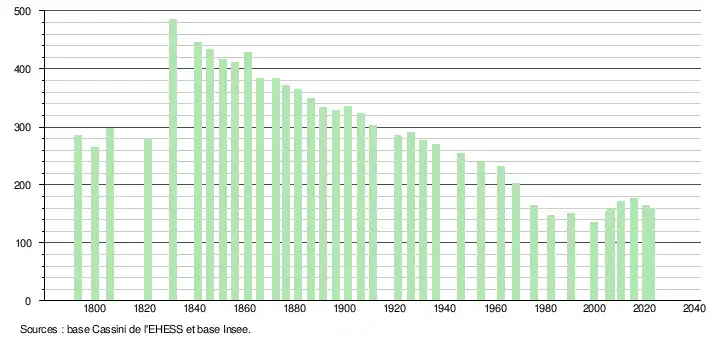 - ↑ Population municipale de référence en vigueur au 1er janvier 2025, millésimée 2022, définie dans les limites territoriales en vigueur au 1er janvier 2024, date de référence statistique : 1er janvier 2022.