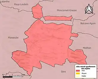 Le retrait-gonflement des sols argileux est susceptible d'engendrer des dommages importants aux bâtiments en cas d’alternance de périodes de sécheresse et de pluie. La totalité de la commune est en aléa moyen ou fort (94,5 % au niveau départemental et 48,5 % au niveau national). Sur les 83 bâtiments dénombrés sur la commune en 2019, 83 sont en aléa moyen ou fort, soit 100 %, à comparer aux 93 % au niveau départemental et 54 % au niveau national. Une cartographie de l'exposition du territoire national au retrait gonflement des sols argileux est disponible sur le site du BRGM[19],[Carte 3].