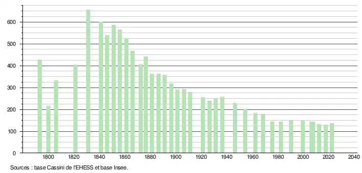 | L'évolution du nombre d'habitants est connue à travers les recensements de la population effectués dans la commune depuis 1793. Pour les communes de moins de 10 000 habitants, une enquête de recensement portant sur toute la population est réalisée tous les cinq ans, les populations de référence des années intermédiaires étant quant à elles estimées par interpolation ou extrapolation[27]. Pour la commune, le premier recensement exhaustif entrant dans le cadre du nouveau dispositif a été réalisé en 2007[28]. En 2022, la commune comptait 137 habitants[Note 5], en évolution de +6,2 % par rapport à 2016 (Gers : +1,04 %, France hors Mayotte : +2,11 %). |