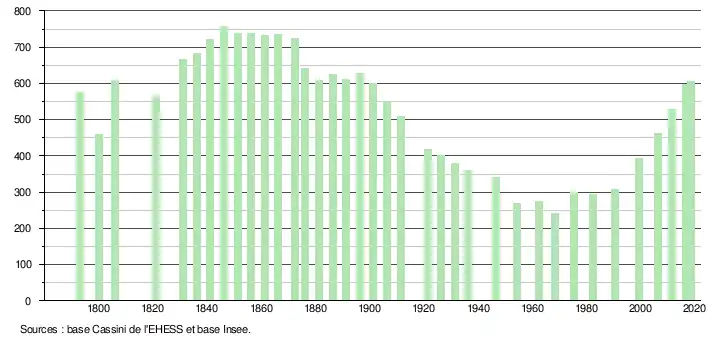 L'évolution du nombre d'habitants est connue à travers les recensements de la population effectués dans la commune depuis 1793. Pour les communes de moins de 10 000 habitants, une enquête de recensement portant sur toute la population est réalisée tous les cinq ans, les populations de référence des années intermédiaires étant quant à elles estimées par interpolation ou extrapolation[6]. Pour la commune, le premier recensement exhaustif entrant dans le cadre du nouveau dispositif a été réalisé en 2006[7].