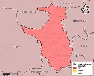 Le retrait-gonflement des sols argileux est susceptible d'engendrer des dommages importants aux bâtiments en cas d’alternance de périodes de sécheresse et de pluie. La totalité de la commune est en aléa moyen ou fort (94,5 % au niveau départemental et 48,5 % au niveau national). Sur les 97 bâtiments dénombrés sur la commune en 2019, 97 sont en aléa moyen ou fort, soit 100 %, à comparer aux 93 % au niveau départemental et 54 % au niveau national. Une cartographie de l'exposition du territoire national au retrait gonflement des sols argileux est disponible sur le site du BRGM[21],[Carte 3].