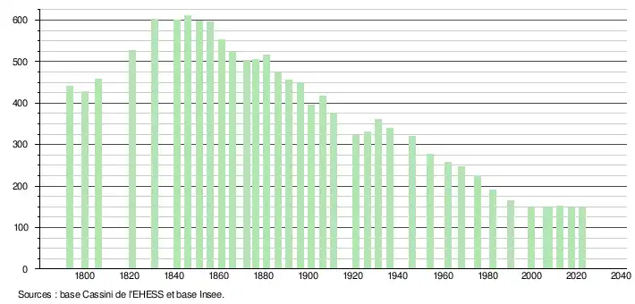 | L'évolution du nombre d'habitants est connue à travers les recensements de la population effectués dans la commune depuis 1793. Pour les communes de moins de 10 000 habitants, une enquête de recensement portant sur toute la population est réalisée tous les cinq ans, les populations de référence des années intermédiaires étant quant à elles estimées par interpolation ou extrapolation[25]. Pour la commune, le premier recensement exhaustif entrant dans le cadre du nouveau dispositif a été réalisé en 2007[26]. En 2022, la commune comptait 150 habitants[Note 2], en évolution de −0,66 % par rapport à 2016 (Gers : +1,04 %, France hors Mayotte : +2,11 %). |