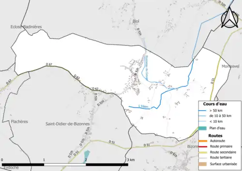 La commune héberge sur son territoire la source du ruisseau de l'Hien (située à proximité du hameau du Bas Belmont), d'une longueur de 17,2 km[2]. Cette petite rivière, qui est un affluent de la Bourbre et donc un sous-affluent du Rhône, se dirige selon un axe nord-sud avant de quitter la commune pour le territoire de la commune voisine de Biol.