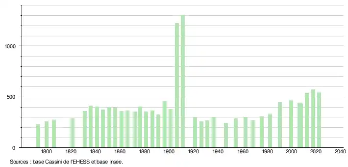 L'évolution du nombre d'habitants est connue à travers les recensements de la population effectués dans la commune depuis 1793. Pour les communes de moins de 10 000 habitants, une enquête de recensement portant sur toute la population est réalisée tous les cinq ans, les populations de référence des années intermédiaires étant quant à elles estimées par interpolation ou extrapolation[18]. Pour la commune, le premier recensement exhaustif entrant dans le cadre du nouveau dispositif a été réalisé en 2007[19].