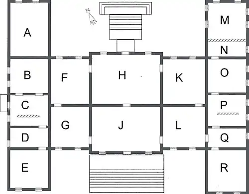 Le hall d'entrée principale, les salles de réceptions et les chambres à coucher familiales étaient situées au rez-de-chaussée et au premier étage au-dessus d'un sous-sol semi-enterré contenant les pièces des serviteurs[16]. Les deux entrées principales du manoir situées au centre des façades Nord et Sud sont accessibles via des escaliers externes. À l'origine, du côté Sud l'escalier était composé d'une double volée et du côté Nord d'une étroite volée, mais chacun a été remplacé depuis par une seule large volée de marches[20]