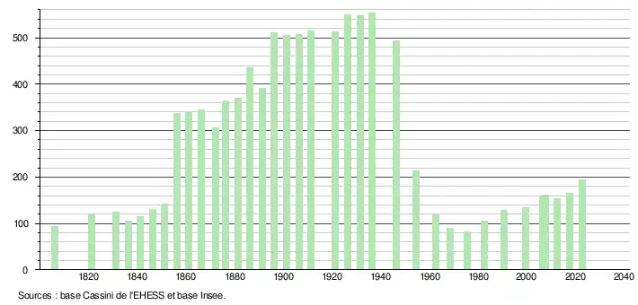 L'évolution du nombre d'habitants est connue à travers les recensements de la population effectués dans la commune depuis 1806. Pour les communes de moins de 10 000 habitants, une enquête de recensement portant sur toute la population est réalisée tous les cinq ans, les populations de référence des années intermédiaires étant quant à elles estimées par interpolation ou extrapolation[8]. Pour la commune, le premier recensement exhaustif entrant dans le cadre du nouveau dispositif a été réalisé en 2007[9].