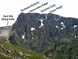 Tower Ridge est la plus longue des quatre arêtes en face nord, avec environ 600 mètres de hauteur. Cotée D (difficult), elle n'est pas très exigeante techniquement et la plupart des ressauts peuvent être franchis sans être encordé par des grimpeurs expérimentés, mais elle est très exposée[36]. Castle Ridge (l'« arête du château »), la première des arêtes principales, est plus facile à escalader, tandis qu'Observatory Ridge (l'« arête de l'observatoire ») est cotée VD (very difficult)[38]. Tower Ridge et Observatory Ridge sont séparées par Gardyloo Gully (la « ravine Gardyloo »), qui tient son nom de l'interjection en français « garde à l'eau », anciennement utilisée dans les villes écossaises comme avertissement au moment où les habitants jetaient leurs résidus usagers dans la rue depuis leurs fenêtres. En effet, la partie supérieure de la ravine a servi de fosse à ordures pour l'ancien observatoire[3]. North-East Buttress (l'« éperon Nord-Est »), la dernière et la plus imposante des arêtes, est la plus proche du sommet et considérée comme la plus difficile en raison de ses passages techniques[39].
