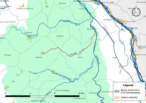 La Benelle traverse 3 communes, soit de l'amont vers l'aval : Jalognes (18), Feux (18), Saint-Bouize (18).
