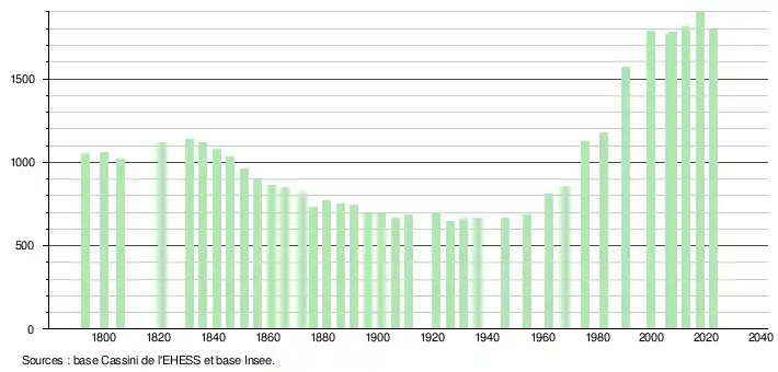 L'évolution du nombre d'habitants est connue à travers les recensements de la population effectués dans la commune depuis 1793. Pour les communes de moins de 10 000 habitants, une enquête de recensement portant sur toute la population est réalisée tous les cinq ans, les populations de référence des années intermédiaires étant quant à elles estimées par interpolation ou extrapolation[37]. Pour la commune, le premier recensement exhaustif entrant dans le cadre du nouveau dispositif a été réalisé en 2007[38].