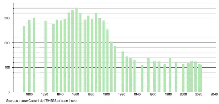 L'évolution du nombre d'habitants est connue à travers les recensements de la population effectués dans la commune depuis 1793. Pour les communes de moins de 10 000 habitants, une enquête de recensement portant sur toute la population est réalisée tous les cinq ans, les populations de référence des années intermédiaires étant quant à elles estimées par interpolation ou extrapolation[17]. Pour la commune, le premier recensement exhaustif entrant dans le cadre du nouveau dispositif a été réalisé en 2005[18].