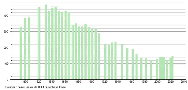 - ↑ Population municipale de référence en vigueur au 1er janvier 2025, millésimée 2022, définie dans les limites territoriales en vigueur au 1er janvier 2024, date de référence statistique : 1er janvier 2022.