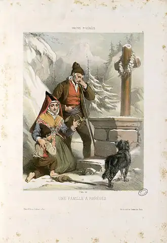 Les attestations de son existence sont donc rares et tardives : si l'illustration du « chien de berger » pour l'Histoire naturelle de Buffon évoque pour certains un face rase[1], il faut attendre le milieu du XIXe siècle pour trouver, sans conteste, la première illustration du berger de Pyrénées dans une œuvre du peintre palois Alfred Dartiguenave, Une famille à Barèges.