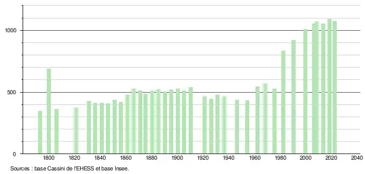 L'évolution du nombre d'habitants est connue à travers les recensements de la population effectués dans la commune depuis 1793. Pour les communes de moins de 10 000 habitants, une enquête de recensement portant sur toute la population est réalisée tous les cinq ans, les populations de référence des années intermédiaires étant quant à elles estimées par interpolation ou extrapolation[24]. Pour la commune, le premier recensement exhaustif entrant dans le cadre du nouveau dispositif a été réalisé en 2008[25].