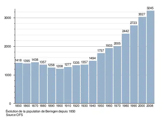 Selon l'Office fédéral de la statistique, Beringen compte 3 245 habitants en 2008[1]. Sa densité de population atteint 229 hab./km2.