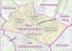 Le quartier est situé sur le plateau de Barnim dans la moitié nord de l'arrondissement. Il confine à l'arrondissement de Pankow à l'ouest et à l'arrondissement de Marzahn-Hellersdorf à l'est. Au Sud, il confine au quartier de Alt-Hohenschönhausen. Au Nord-Ouest, le territoire s'étend jusqu'au quartier de Malchow ; au Nord, il borde aux quartiers de Wartenberg et de Falkenberg.