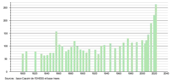 L'évolution du nombre d'habitants est connue à travers les recensements de la population effectués dans la commune depuis 1800. Pour les communes de moins de 10 000 habitants, une enquête de recensement portant sur toute la population est réalisée tous les cinq ans, les populations de référence des années intermédiaires étant quant à elles estimées par interpolation ou extrapolation[19]. Pour la commune, le premier recensement exhaustif entrant dans le cadre du nouveau dispositif a été réalisé en 2004[20].