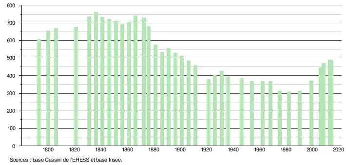 L'évolution du nombre d'habitants est connue à travers les recensements de la population effectués dans la commune depuis 1793. Pour les communes de moins de 10 000 habitants, une enquête de recensement portant sur toute la population est réalisée tous les cinq ans, les populations de référence des années intermédiaires étant quant à elles estimées par interpolation ou extrapolation[3]. Pour la commune, le premier recensement exhaustif entrant dans le cadre du nouveau dispositif a été réalisé en 2008[4].