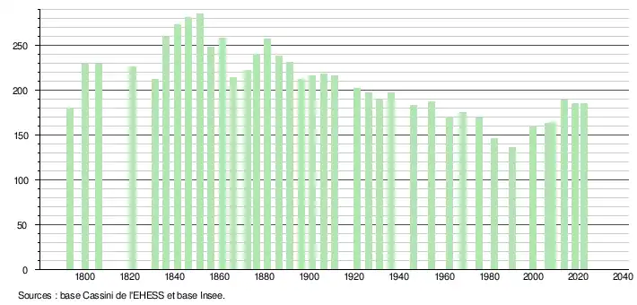 | L'évolution du nombre d'habitants est connue à travers les recensements de la population effectués dans la commune depuis 1793. Pour les communes de moins de 10 000 habitants, une enquête de recensement portant sur toute la population est réalisée tous les cinq ans, les populations de référence des années intermédiaires étant quant à elles estimées par interpolation ou extrapolation[27]. Pour la commune, le premier recensement exhaustif entrant dans le cadre du nouveau dispositif a été réalisé en 2008[28]. En 2022, la commune comptait 185 habitants[Note 4], en évolution de −1,07 % par rapport à 2016 (Tarn : +2,52 %, France hors Mayotte : +2,11 %). |