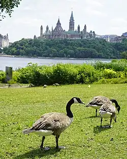 Des bernaches du Canada broutent de l'autre côté de la rivière devant le Parlement canadien.