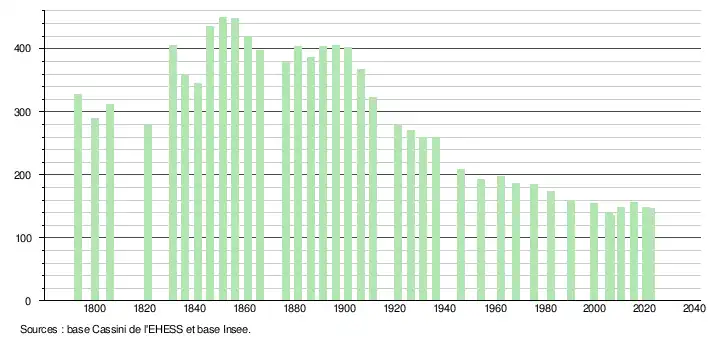 - ↑ Population municipale de référence en vigueur au 1er janvier 2025, millésimée 2022, définie dans les limites territoriales en vigueur au 1er janvier 2024, date de référence statistique : 1er janvier 2022.