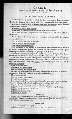 Deux documents fondateurs, une charte revendicative[15] déclinant les principes fondamentaux réclamés pour les femmes ainsi qu’un manifeste[16], plus politique, sont votés, sous sa présidence, lors de ce congrès. Dans son autobiographie de 1937, elle revendique le fait d’avoir obtenu le vote du manifeste presque à l’unanimité.