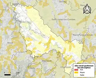 Le retrait-gonflement des sols argileux est susceptible d'engendrer des dommages importants aux bâtiments en cas d’alternance de périodes de sécheresse et de pluie[16]. 14,2 % de la superficie communale est en aléa moyen ou fort (27 % au niveau départemental et 48,5 % au niveau national métropolitain)[Carte 2]. Depuis le , en application de la loi ÉLAN, différentes contraintes s'imposent aux vendeurs, maîtres d'ouvrages ou constructeurs de biens situés dans une zone classée en aléa moyen ou fort[Note 2],[17].