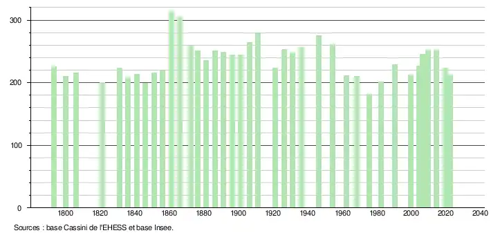 L'évolution du nombre d'habitants est connue à travers les recensements de la population effectués dans la commune depuis 1793. Pour les communes de moins de 10 000 habitants, une enquête de recensement portant sur toute la population est réalisée tous les cinq ans, les populations de référence des années intermédiaires étant quant à elles estimées par interpolation ou extrapolation[26]. Pour la commune, le premier recensement exhaustif entrant dans le cadre du nouveau dispositif a été réalisé en 2004[27].