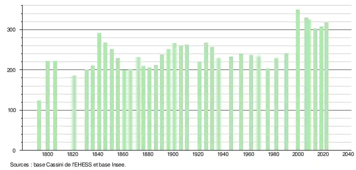 L'évolution du nombre d'habitants est connue à travers les recensements de la population effectués dans la commune depuis 1793. Pour les communes de moins de 10 000 habitants, une enquête de recensement portant sur toute la population est réalisée tous les cinq ans, les populations de référence des années intermédiaires étant quant à elles estimées par interpolation ou extrapolation[24]. Pour la commune, le premier recensement exhaustif entrant dans le cadre du nouveau dispositif a été réalisé en 2008[25].