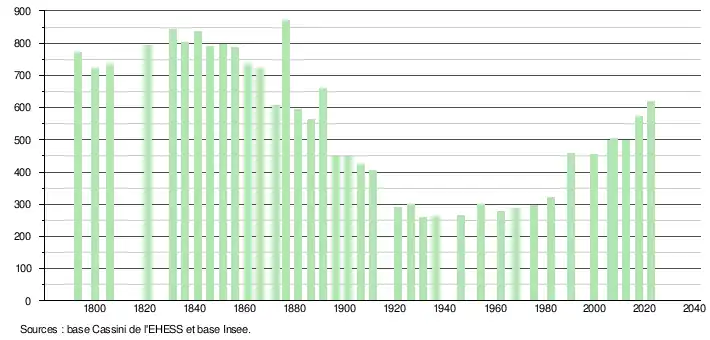 L'évolution du nombre d'habitants est connue à travers les recensements de la population effectués dans la commune depuis 1793. Pour les communes de moins de 10 000 habitants, une enquête de recensement portant sur toute la population est réalisée tous les cinq ans, les populations de référence des années intermédiaires étant quant à elles estimées par interpolation ou extrapolation[22]. Pour la commune, le premier recensement exhaustif entrant dans le cadre du nouveau dispositif a été réalisé en 2007[23].