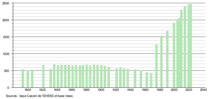 L'évolution du nombre d'habitants est connue à travers les recensements de la population effectués dans la commune depuis 1793. Pour les communes de moins de 10 000 habitants, une enquête de recensement portant sur toute la population est réalisée tous les cinq ans, les populations de référence des années intermédiaires étant quant à elles estimées par interpolation ou extrapolation[21]. Pour la commune, le premier recensement exhaustif entrant dans le cadre du nouveau dispositif a été réalisé en 2004[22].