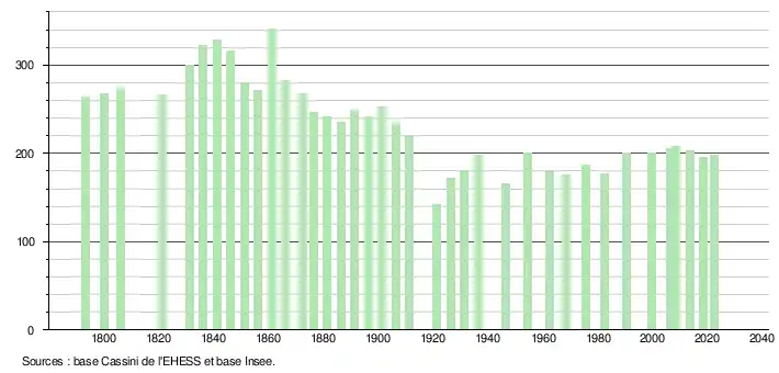 L'évolution du nombre d'habitants est connue à travers les recensements de la population effectués dans la commune depuis 1793. Pour les communes de moins de 10 000 habitants, une enquête de recensement portant sur toute la population est réalisée tous les cinq ans, les populations de référence des années intermédiaires étant quant à elles estimées par interpolation ou extrapolation[22]. Pour la commune, le premier recensement exhaustif entrant dans le cadre du nouveau dispositif a été réalisé en 2008[23].