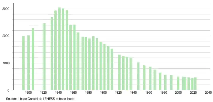 L'évolution du nombre d'habitants est connue à travers les recensements de la population effectués dans la commune depuis 1793. Pour les communes de moins de 10 000 habitants, une enquête de recensement portant sur toute la population est réalisée tous les cinq ans, les populations de référence des années intermédiaires étant quant à elles estimées par interpolation ou extrapolation[15]. Pour la commune, le premier recensement exhaustif entrant dans le cadre du nouveau dispositif a été réalisé en 2008[16].