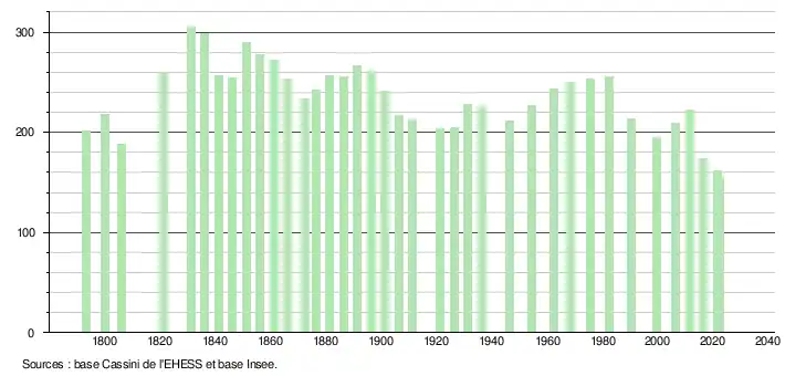 - ↑ Fiches Insee - Populations de référence de la commune pour les années 2006, 2007, 2008, 2009, 2010, 2011, 2012, 2013, 2014, 2015, 2016, 2017, 2018, 2019, 2020, 2021 et 2022.