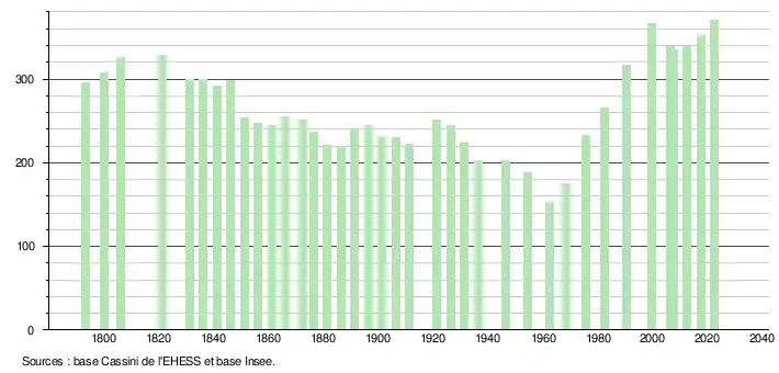 L'évolution du nombre d'habitants est connue à travers les recensements de la population effectués dans la commune depuis 1793. Pour les communes de moins de 10 000 habitants, une enquête de recensement portant sur toute la population est réalisée tous les cinq ans, les populations de référence des années intermédiaires étant quant à elles estimées par interpolation ou extrapolation[20]. Pour la commune, le premier recensement exhaustif entrant dans le cadre du nouveau dispositif a été réalisé en 2007[21].