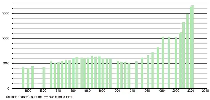 L'évolution du nombre d'habitants est connue à travers les recensements de la population effectués dans la commune depuis 1793. Pour les communes de moins de 10 000 habitants, une enquête de recensement portant sur toute la population est réalisée tous les cinq ans, les populations de référence des années intermédiaires étant quant à elles estimées par interpolation ou extrapolation[22]. Pour la commune, le premier recensement exhaustif entrant dans le cadre du nouveau dispositif a été réalisé en 2005[23].