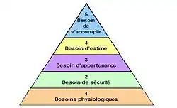 Le psychologue américain Abraham Maslow classe les besoins de manière hiérarchique, ses successeurs les représenteront sous la forme d'une pyramide, mais cette pyramide est une idée de Maslow lui-même. L'idée forte et positive de cette vision est qu'il convient d'abord — par analogie avec la façon dont on réalise une construction — de travailler les fondations, puis d'édifier successivement — l'un après l'autre — les différents étages supérieurs. Ainsi en priorité, il s'agit de satisfaire d'abord les « besoins fondamentaux », puis un à un, les besoins de « niveau inférieur », avant de pouvoir satisfaire de manière progressive les besoins situés aux niveaux supérieurs de la « pyramide ».