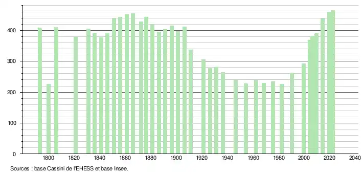 L'évolution du nombre d'habitants est connue à travers les recensements de la population effectués dans la commune depuis 1793. Pour les communes de moins de 10 000 habitants, une enquête de recensement portant sur toute la population est réalisée tous les cinq ans, les populations de référence des années intermédiaires étant quant à elles estimées par interpolation ou extrapolation[8]. Pour la commune, le premier recensement exhaustif entrant dans le cadre du nouveau dispositif a été réalisé en 2004[9].